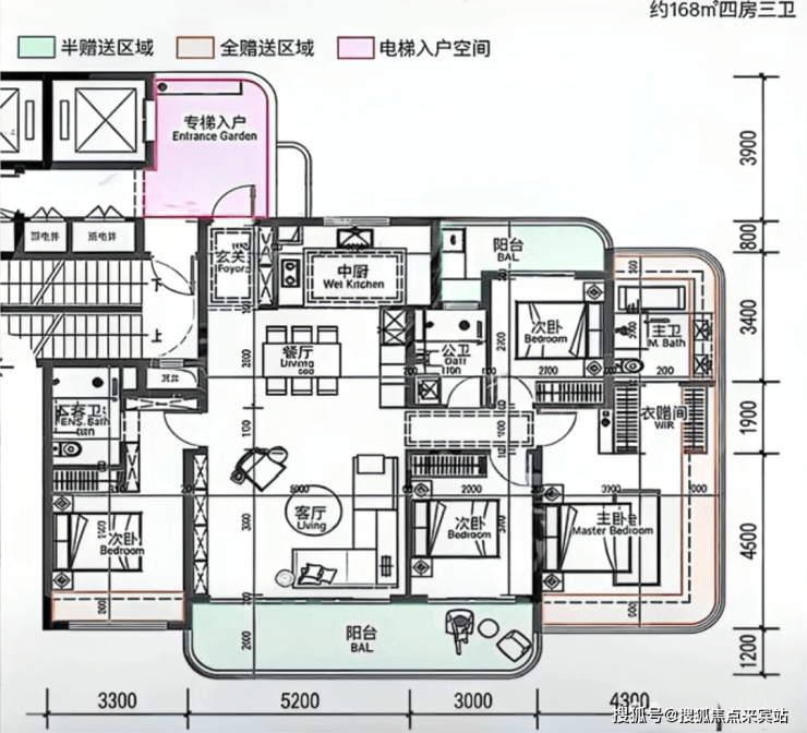 7栋的168平米户型,共46套,四房三卫三套房设计,专梯入户,竖厅出阳台,阳台超过8米,客厅开间约5.2米,两个户型都是正南朝向,可以看园林。另外,168平户型后续还有加推,分布在10栋,是东南朝向看园林,也可能看部分城市景观,与7栋景观面类似。