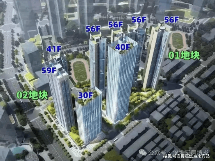 01-02地块占地约1.23万平方米,总建筑面积约15.08万平方米,计容建筑面积约10.85万平方米,容积率为8.31,绿化率为40.01%。该地块包含2栋住宅楼,分别为41层和59层,以及1栋30层的办公楼和1所9班制幼儿园。总规划1194户,住宅楼采用3梯4户设计,其中包括972套保障房。