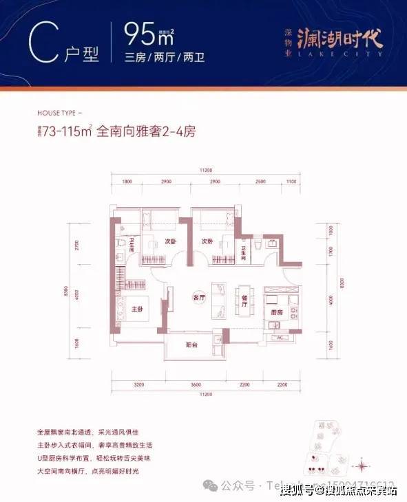 95㎡的3房2厅2卫,设计的是横厅南北通透格局,客餐厅一体化5.8米开间,3个卧室分别做到了3.2米/2.9米/2.9米的宽度,主卧套间设计,U型厨房,卫生间干湿分离,得房率77-78%(不含赠送),阳台主朝西南或东南向。
