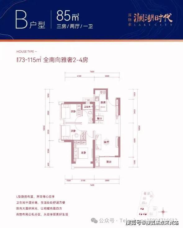 85㎡的3房2厅1卫,设计的是竖厅格局,客厅3.5米开间,LDKB一体化设计,3个卧室分别做到了3.1米/2.9米/2.5米的宽度,L型厨房,卫生间三段式分离,得房率77-78%(不含赠送),阳台西南或东南朝向。