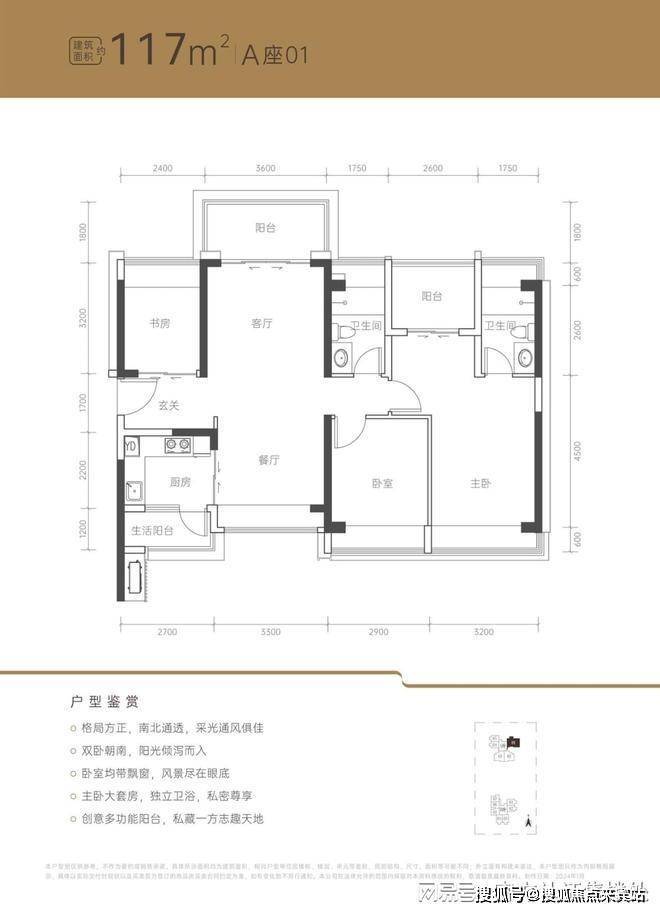 117㎡3+1房2厅2卫:竖厅南北通透格局,客厅3.6米开间,四开间朝南,4个卧室分别做到了3.2米/2.9米/2.6米/2.4米的宽度,阳台主朝正北向。户型亮点:南北通透,中心楼王公园景观,三开间朝南,端头位且独门独户,卧室均带飘窗。折后总价741-836万/套,单价6.44-7.15万/㎡。