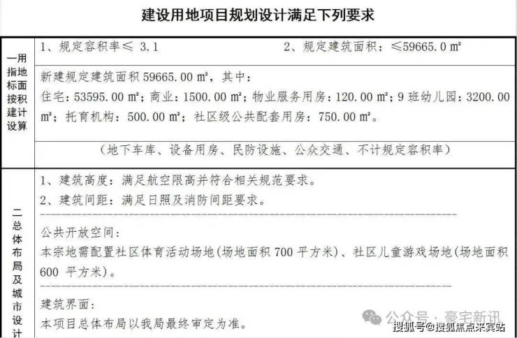 根据规划设计要求,地块占地面积19246.94㎡,规定容积率≤3.1,建筑面积59665㎡,包括53595㎡住宅,1500㎡商业,住宅和商业允许分割转让;另有还规划有3200㎡9班幼儿园,以及500㎡托育机构等。
