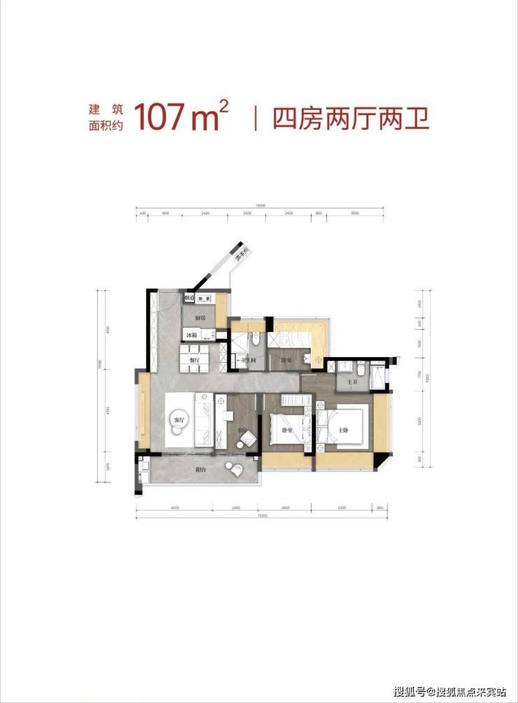 110㎡的4房2厅2卫,设计的是横厅南北通透格局,进门入户玄关,客餐厅6米开间,LDKB一体化,4个卧室分别做到了4.1米/3米/2.5米/2.4米的宽度,主卧套房设计,客厅连接次卧出6.7米长的大阳台,L型厨房,卫生间干湿分离,阳台主朝西南向。
