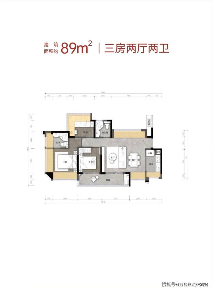 89㎡的3房2厅2卫,设计的是竖厅格局,客厅3.4米开间,LDKB一体化,S墙设计预留冰箱卡槽位,3个卧室分别做到了3.9米/2.9米/2.6米的宽度,客厅连接次卧出6.3米长的大阳台,L型厨房,卫生间干湿分离,有西北、西南或东南朝向。