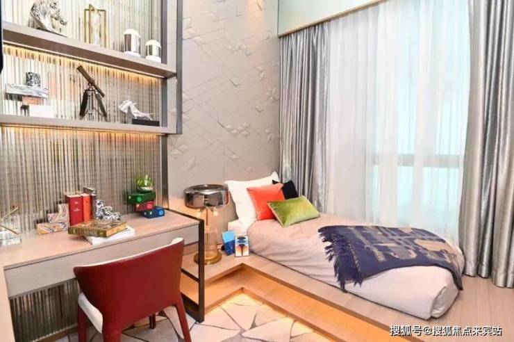 另一睡房空间实用,睡床置于地台上,左边有书桌,住户可在房内安静阅读。