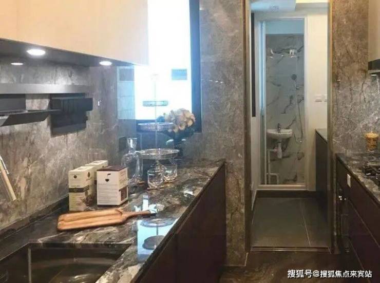 厨房以深色云石铺砌,两旁亦有工作枱,配以白色厨柜,颜色配搭突出,并设16平方呎工作平台。