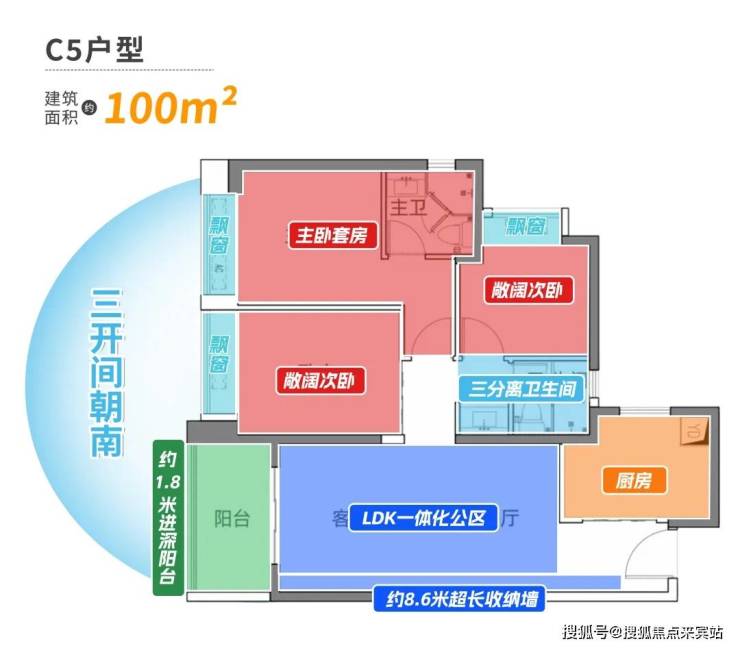 约100㎡的三房户型,三开间全部朝南,通风采光无死角,尽享阳光的宠溺。