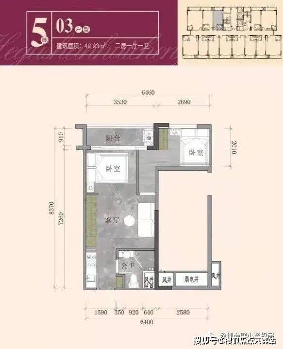 第三栋:5梯6户,总高层22层,整层面积1592.28平,132户