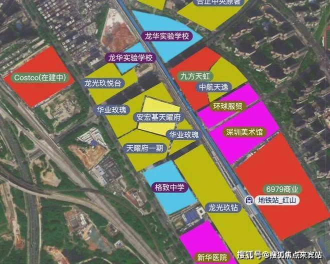北侧为天虹购物中心,远一点有红山6979、AT MALL上塘荟、Costco华南会员旗舰店(龙华民治店)。