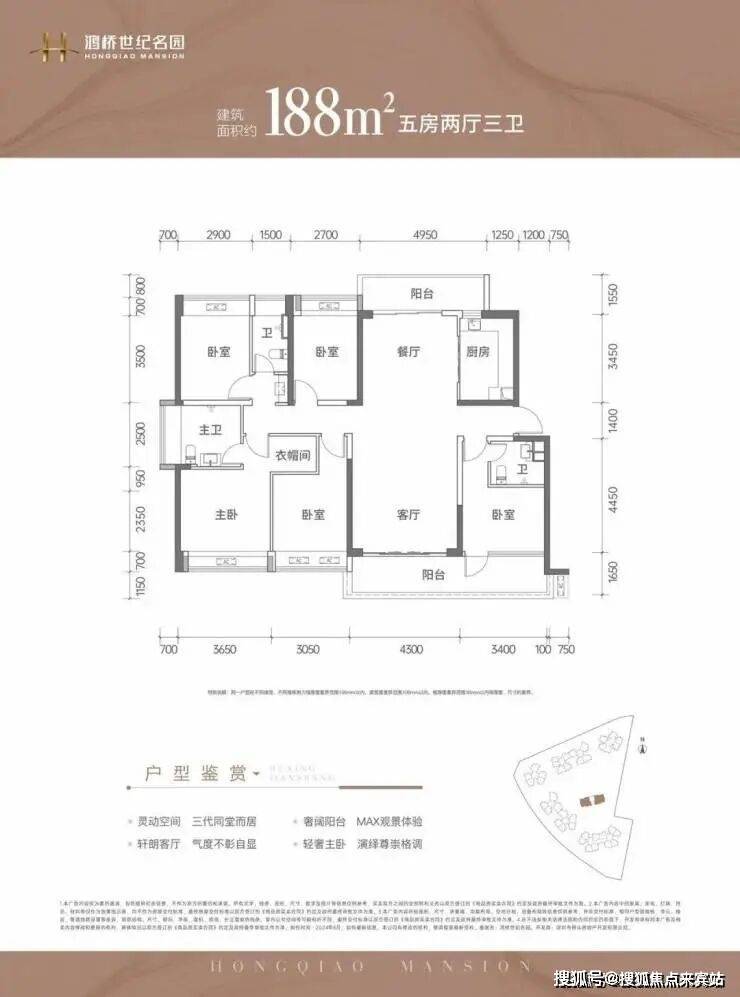 188㎡的5房2厅3卫,设计的是竖格局,南北通透双阳台,客厅4.3米开间,LDKB一体化设计,双主卧套间设计,5个卧室分别做到了主卧14.6㎡/套间9.22㎡/次卧13.2㎡/次卧12.18㎡/次卧11.34㎡(包含墙体飘窗),L型厨房带1个小生活阳台,公卫三段式分离,客厅阳台连接次卧出7.7米长的大阳台,得房率约73.5%(不含赠送),主朝正南向。