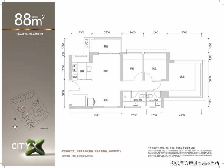 88平户型,南北通透的双厅设计,不论楼层高低通风采光视野均非常舒适通透,适合三口之家从容生活。