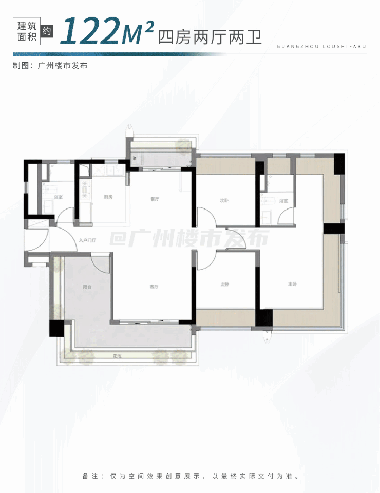 ②建面约118/122㎡:四房两厅两卫设计,共有2个户型可选,四开间朝南,居住与生活动静分离,大尺度阳台或南北双阳台,主卧带270°飘窗