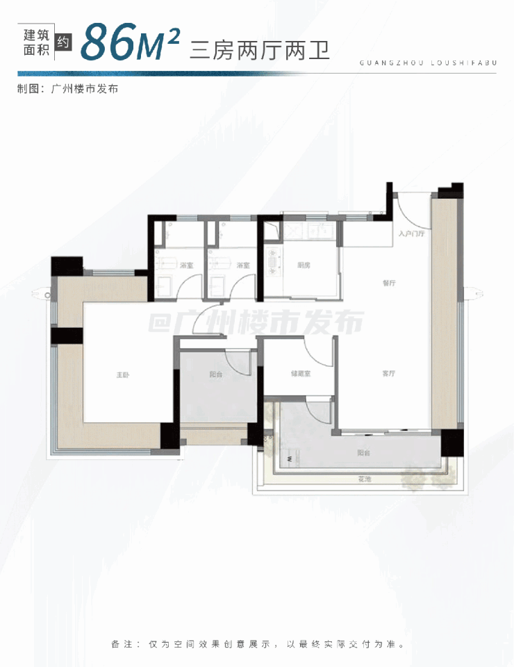 ①建面约86㎡:三房两厅两卫设计,南向观景大阳台,全屋动静分离,主卧带270°飘窗