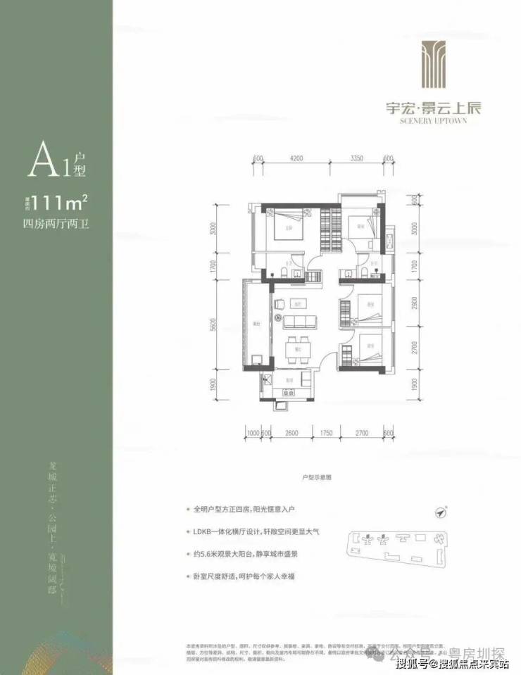 111㎡的4房2厅2卫,设计的是横厅南北通透格局,客餐厅5.6米开间,LDKB一体化,五开间朝南,4个卧室分别做到了3米/3米/2.9米/2.7米的宽度,客厅连接餐厅位出5.6米长的大阳台,L型厨房,公卫生三段式分离,得房率约76%(不含赠送),阳台主朝西南向。