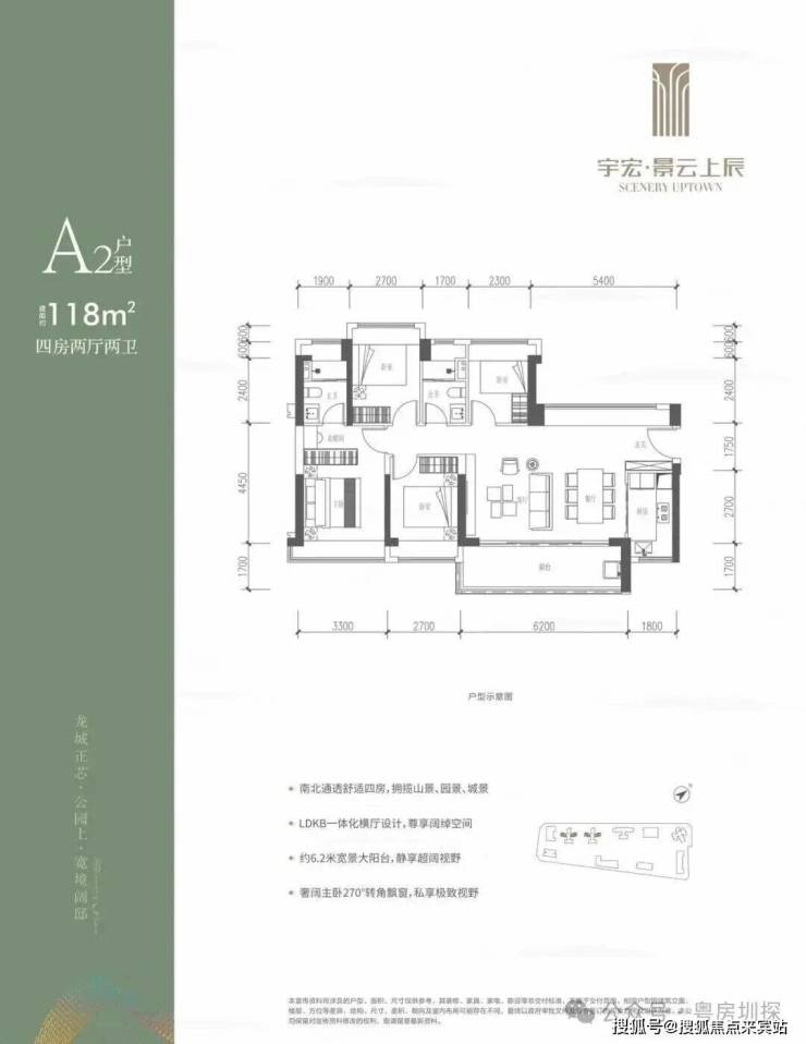 118㎡的4房2厅2卫,设计的是横厅南北通透格局,客餐厅6.2米开间,LDKB一体化,五开间朝南,西北面5.4米长的观景大飘窗,4个卧室分别做到了3.3米/2.7米/2.7米/2.3米的宽度,客厅连接餐厅位出6.2米长的大阳台,L型厨房,卫生间干湿分离,得房率约76%(不含赠送),东南朝向。