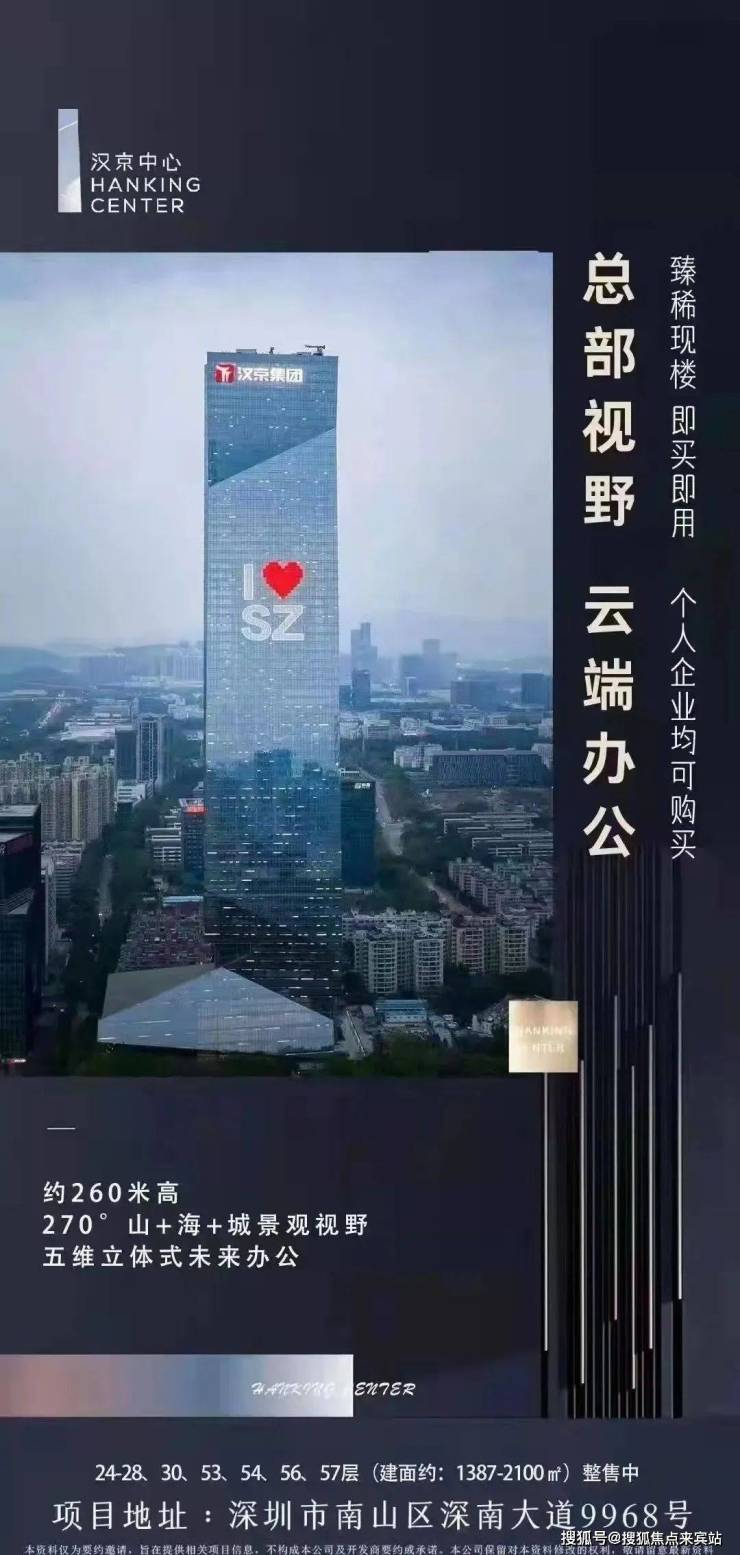 汉京中心位于深圳深南大道旁,集商业与商务于一体的超甲级写字楼。该建筑为亚洲最高全钢结构大楼,高350米,是世界最高核心筒分离建筑、世界最多蝶形节点建筑,也是唯一可售的稀缺资产和城市地标性建筑。由精诚建设者中建四局打造,荣获中国建筑钢结构行业工程质量最高荣誉“中国钢结构金奖”。乘坐扶梯至办公区大堂,沿途可欣赏深南大道和深圳大学风景;步入商业裙房,流动感环绕四周,空间形式随视线上移而变化,巨大中庭成视觉焦点。