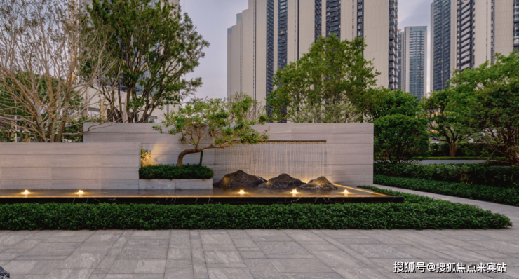 瀚府项目打造新中式园林景观,布置有罗汉松、丛生朴树与丛生香樟等名贵树种,
