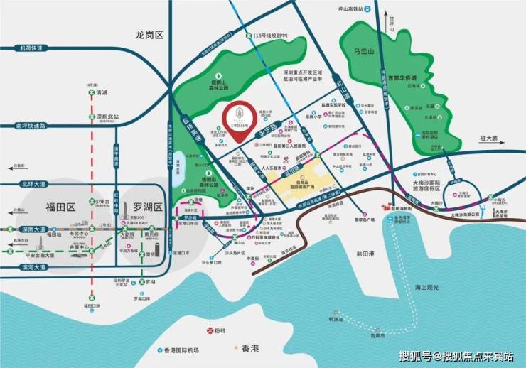 项目近拥丰富山海旅游资源——中英街、大小梅沙、东部华侨城、海鲜街等众多国内外知名景点,滨海风光与绿色群山交汇,为盐田打造一张不可复制的山海名片。