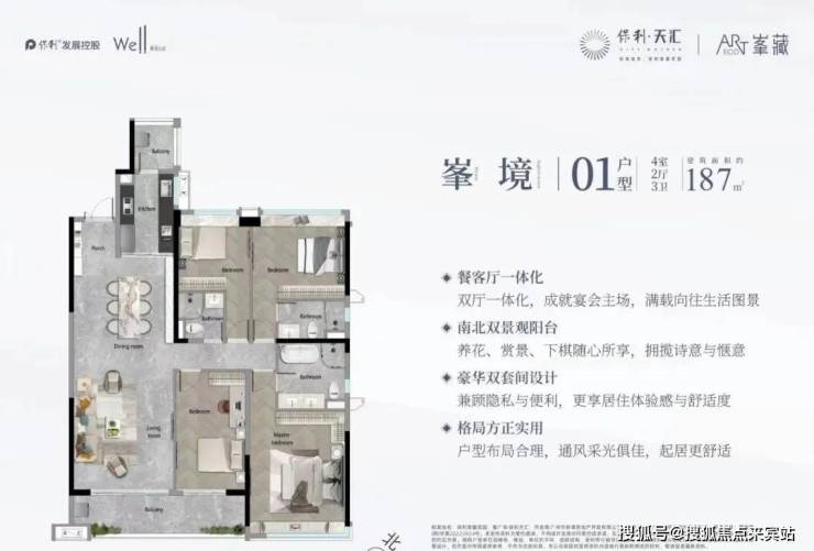 建面116平四房,三开间朝南,有南向,东向两个朝向,竖厅设计,独立玄关,干湿分离卫浴空间,2+2四房,约6米的景观阳台,主卧面积约18平,配置大飘窗,独立卫浴