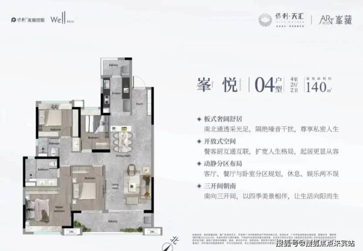 建面140平四房,南北对流户型,南向三开间,餐客厅一体化设计