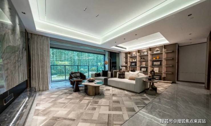 天汇五期做了双大堂的设计,负一层也有入户大堂,岩板的背景墙+金属包边,还有高端项目标配的星空顶。