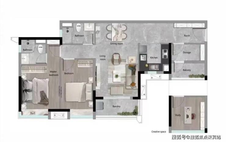 建面99平三房,一进门就是个书房,一半面积为赠送,主卧也是套房设计