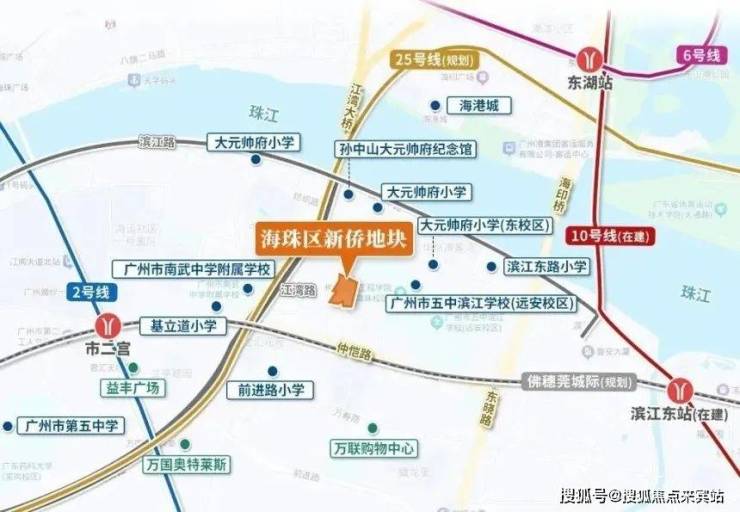 1 公里内有大元帅府小学(市一级)、滨江东路小学、广州市第五中学(省一级)等,配建幼儿园规划中,但优质公立小学对口尚未明确,存在一定不确定性;
