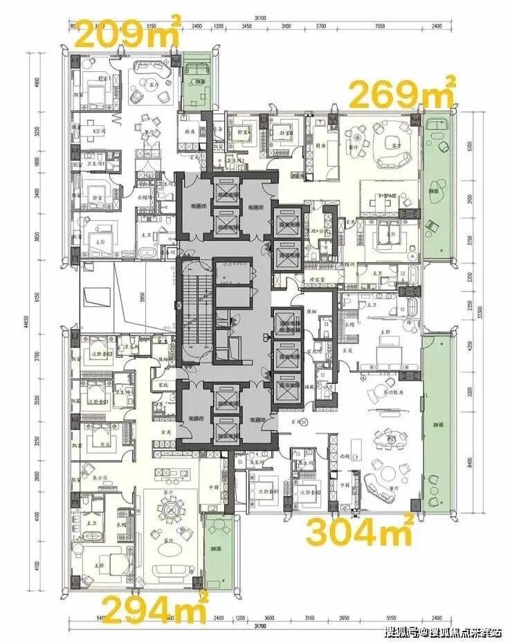 项目首推北区1-2栋共348套房源,户型覆盖209-1100㎡,全部四房三卫起步,彻底告别刚需化设计,保证了圈层的纯粹性。其中,高区58层以上为500-700㎡的顶级大平层,顶楼1100㎡的顶奢大平层仅2套,总价从3000万起,顶楼更是高达4-5亿,单价区间在14-46万/㎡,精准锁定金字塔尖客群。