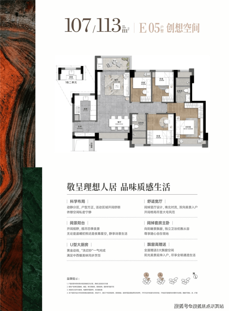 107-113㎡的4房2厅2卫,设计的是竖厅南北通透格局,进门入户玄关,LDB一体化设计,全屋8面飘窗,四开间朝南,U型厨房,卫生间干湿分离,得房率约76-81%(不含赠送),阳台主朝西北向。
