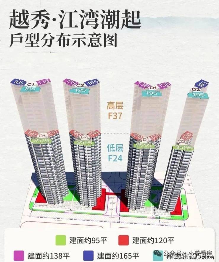 项目共规划4栋住宅楼,均为37层,分高低区设计,而且梯户比跟户型都各不相同:
