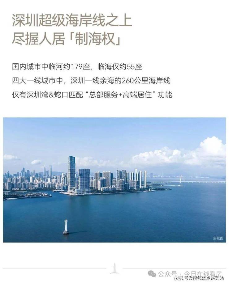 - 产品设计:纯板楼结构,3梯1户/3梯2户设计,南北通透;层层户户看海,部分楼栋(1栋)为纯公寓且带阳台;270°环幕海景(正南向无遮挡,西侧、北侧亦有内湾海景),是深圳湾距离海更近、视野更优的顶级公寓(优于深圳湾一号、瑞府等竞品)。