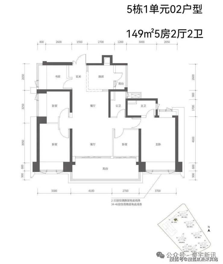 【五栋一单元-平面图】3梯3户,3条腿,分别是01、03号房户型约173㎡的5房2厅2卫、02号房户型约149㎡的5房2厅2卫