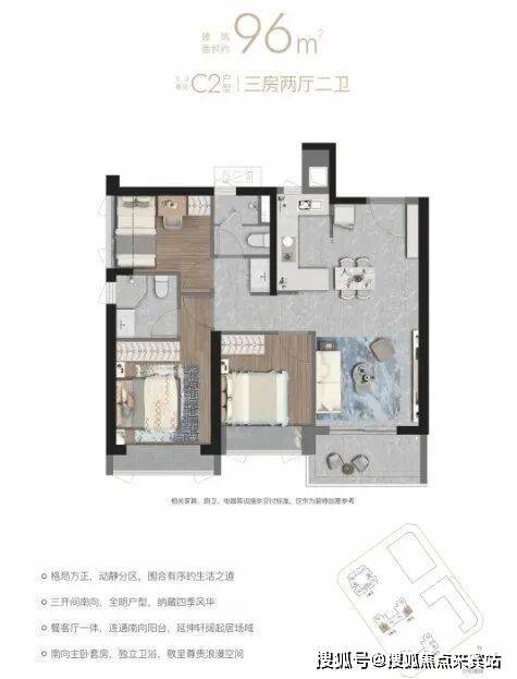 C2户型96㎡三房两厅两卫:方正全明南向三房,格局方正,围合设计。