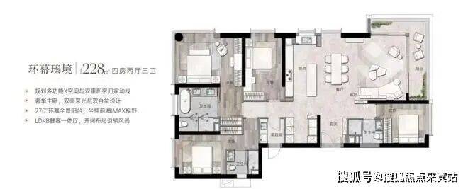 建面约228㎡的4房3卫户型,总价1300万起。这个户型最大的亮点是拥有270°巨幕视野的转角阳台,高区单位可俯瞰前海天际线和海湾景观。户型设计为四房全明格局,主卧带独立衣帽间和卫浴,既适合家族居住,也非常适合商务接待。