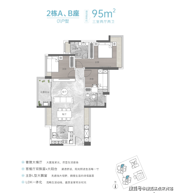 ⑥:建面约95㎡是横厅三房两厅两卫户型,结构没那么规整,优点在于它是横厅,单看户型图客厅是通透的,实则是伪通透,阳台的另外一侧对着的是两条腿之间的廊道,进光亮和通风性能比较局限。