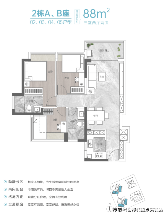 ⑤:建面约88㎡是竖厅三房两厅两卫户型,这个结构就是最长见的那种,说不上有什么优势,也没可吐槽的明显缺陷,目测它的得房率应该会比87㎡的高,毕竟飘窗面积更大了。