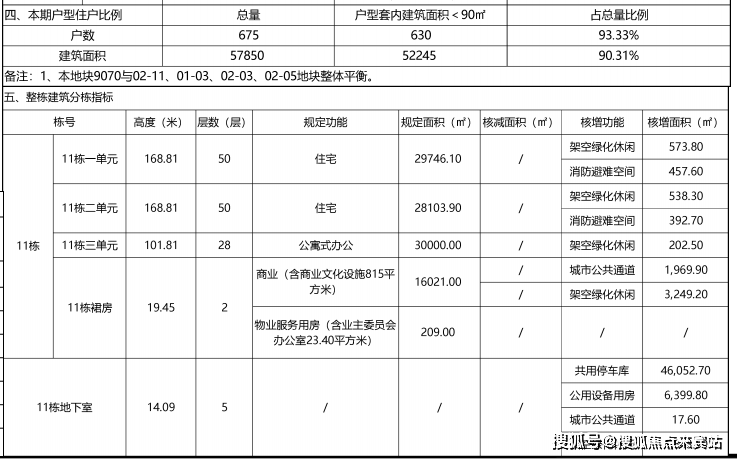 11栋用地性质为二类居住用地+商业用地,总占面约1.5万㎡,规划建面约10.4万㎡,其中住宅建面约5.8万㎡、商业约1.6万㎡、公寓式办公(商务公寓)约3万㎡,及相关物业服务用房。