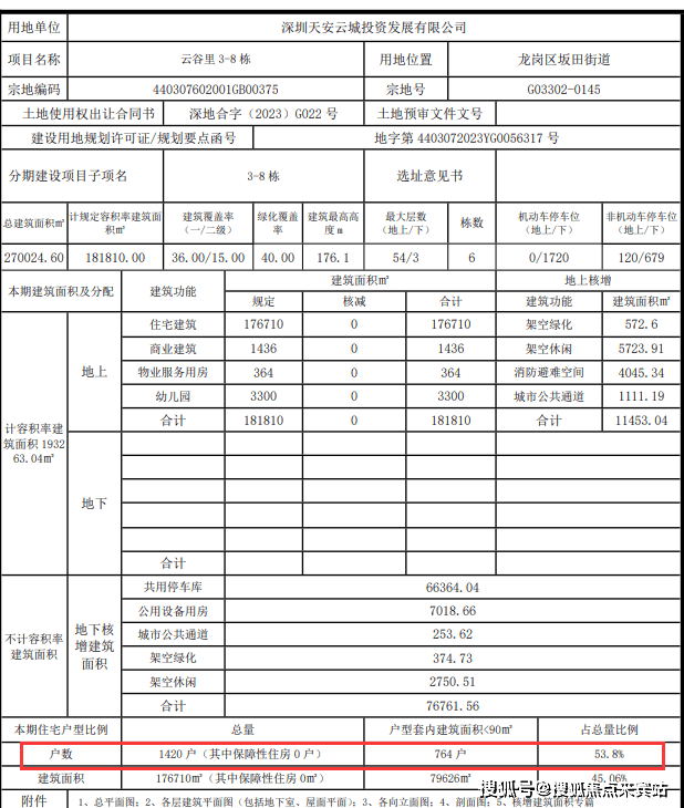 规划住宅1420套,其中套内建面<90㎡的占比约53.8%。