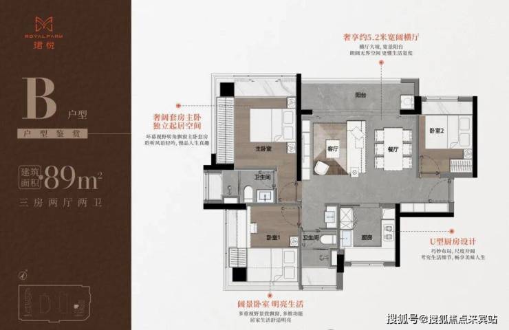 89㎡三房二卫A/B户型,位于1栋一单元,两开间阳台,主卧都有双面凸窗赠送。