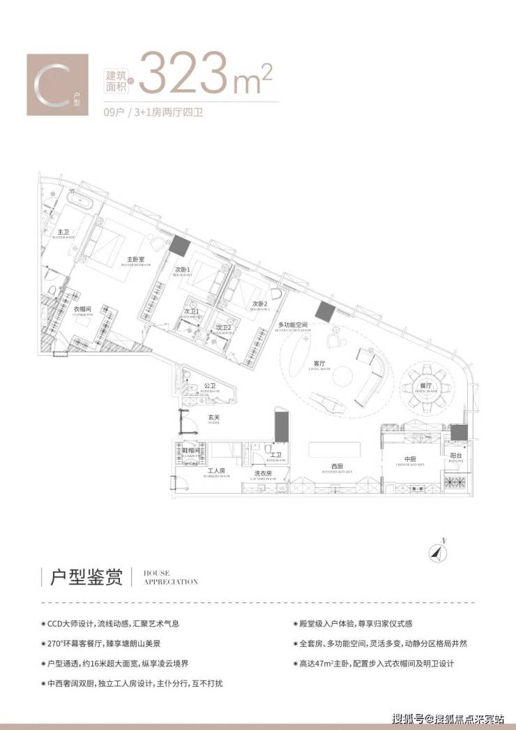 C户型323㎡,3+1房,2厅2厨4卫,东北向,山景,全套房。