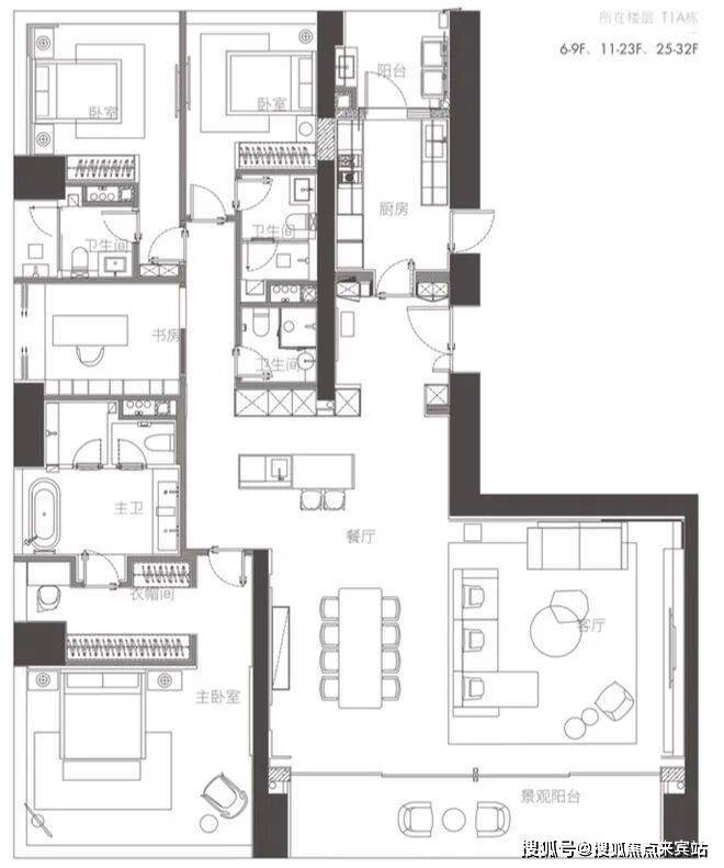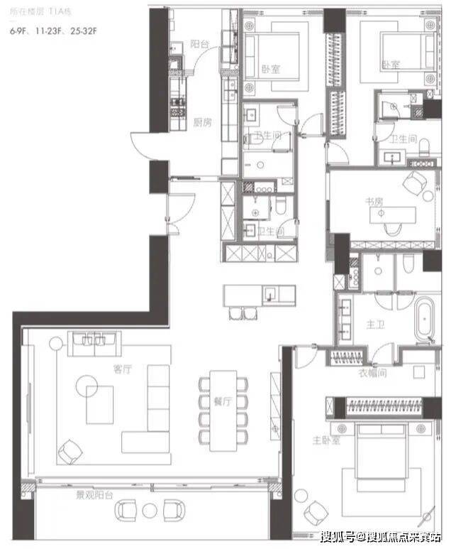 01户型 西端户 约350㎡ 四房两厅四卫(01、04镜像对称),南、西、北,三面景观视野,看深圳湾海景、内海景、城市景观