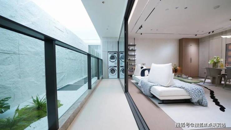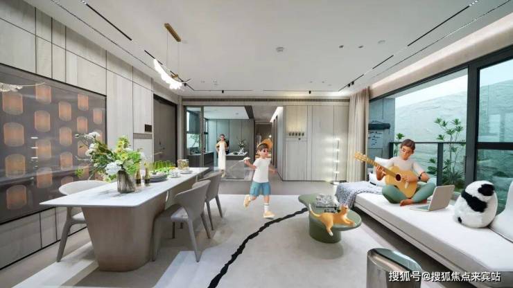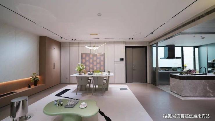 一进玄关,中轴为庭,串起厨房、餐厅、客厅及阳台,构成一个家庭交流的超级广域公区。约40㎡超大方厅样板间实景图