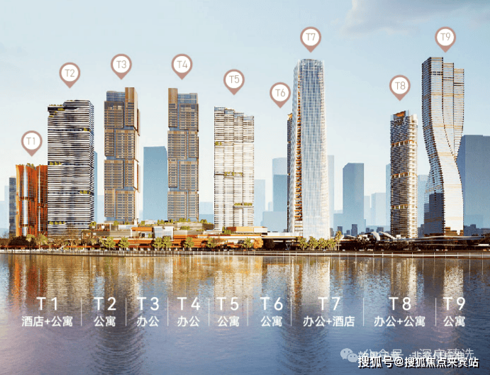 T3和T4是约280米的双子塔超甲级写字楼,幕墙装饰高度291米;T5栋为甲级写字楼,高约250米;T7是超甲级办公楼,约250米;T9为公寓楼,300米。