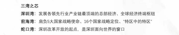 -七大全球总部基地,激荡全球资本的湾区超核,由总部经济带串联,吸引大批诸如腾讯、大疆、阿里巴巴等行业龙头企业,以及大批总部企业入驻,未来将吸引260万人才聚集。