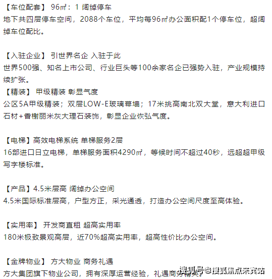 地下4层2088个停车位,本栋地上39层,大堂高17米,16部原装进口日立电梯;