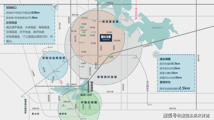 项目至深圳北站直线距离5.8公里,车行需15分钟;经坂银通道,直达福田CBD、华强北车行约20分钟