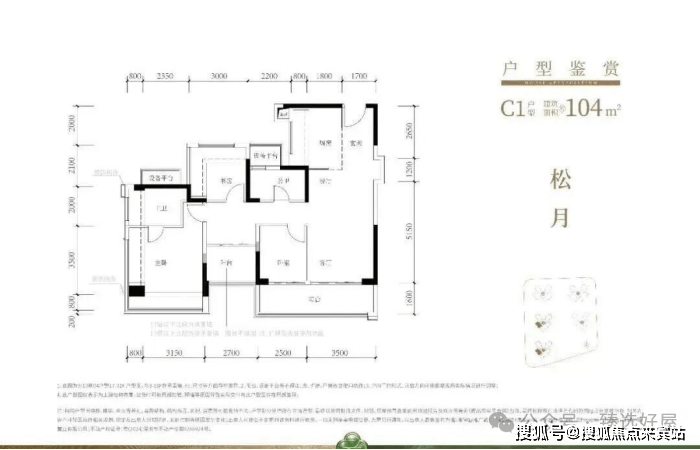 104㎡的4房2厅2卫 ,C1-C2户型,设计的是经典竖厅格局,进门入户玄关,客厅3.5米开间,LDKB一体化,S墙设计预留冰箱卡槽位,动静分区,四开间朝南, 分别做到了主卧17.98㎡/次卧8.37㎡/次卧8.1m²/次卧7.75㎡(包含墙体飘窗) ,L型厨房,公卫干湿分离带1个约2m²的设备平台, 得房率约79.2%(不含赠送) ,客厅连接次卧出9.6m²的观景大阳台,东南或西南朝向。 套内面积82.58m²+赠送面积23.86m²=实用面积106.44m²,加上赠送后得房率约102.04%。