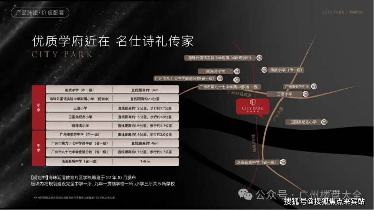 3、教育:项目周边直线距离约1.3km是南武小学(市一级),直线距离约 1.5km是广州市劬劳中学(市一级) ,直线距离约1.4km是广州市第九十七中学高中部(省一级) ,直线距离约 1.4km 是洛溪新城中学 (省一级)。
