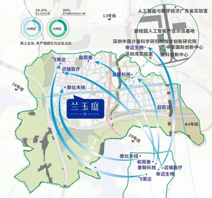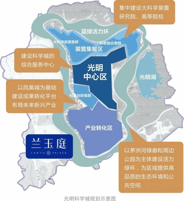 • 光明科学城占据广深港科技创新走廊重要节点,将建设成世界一流科学城和深圳北部中心,定位为大湾区综合性国家科学中心先行启动区,打造“中国新硅谷”。项目傲踞光明科学城南部,未来一片光明。