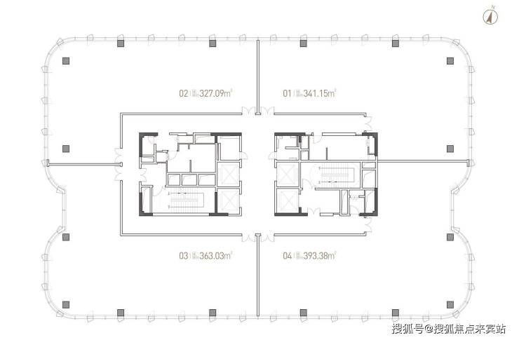 标准层分割面积:建筑面积约327㎡-约341㎡-约363㎡-约393㎡